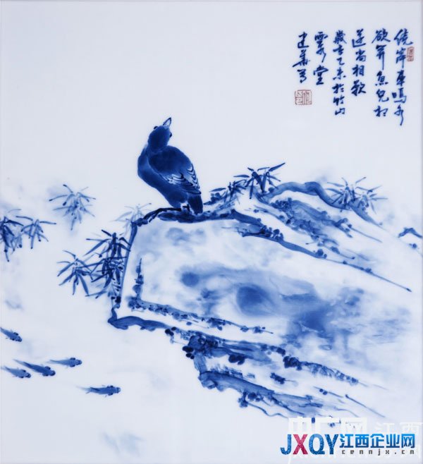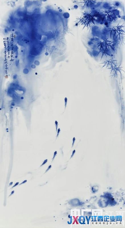 何建華的作品《清泉十里魚兒游》,與其說濃墨勾勒的是邊際,不如說顯現(xiàn)的是經(jīng)緯。畫中以潑墨青花成水、分水成魚,細致處勾線,虛渺處流釉。層層疊疊的暈染下是酣暢淋漓的水墨,作品不乏層次感,遠近虛實,構(gòu)圖寓意,無不錯落有致,相映成趣。而游魚的出現(xiàn)不僅有添補右方空白的作用,更有平衡上重下輕的平衡感。設(shè)色濃而不艷,典雅清麗, 構(gòu)圖簡明新穎,表現(xiàn)出一定的裝飾效果,畫面意境被這些流淌的青花釉料營造得飄逸、靈動。