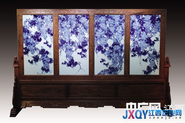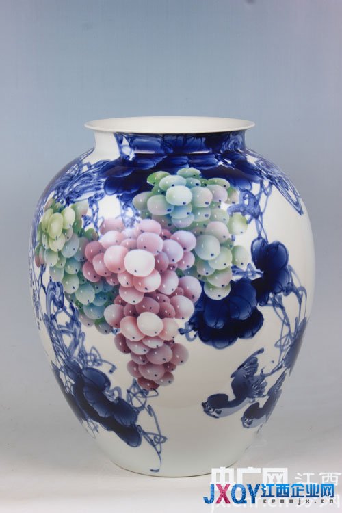 吳志輝的光影青花有國畫的構(gòu)圖筆墨和神韻,一點一畫一筋一葉,寫意中透露的是他的水墨修養(yǎng)。同時,運用了西畫黑白灰的對比,使得造型虛實相生、立體鮮活,通過精心布局和青花噴花的深淺濃淡變化,他描繪出的景物呈現(xiàn)著強烈的空間感,光影生動、形態(tài)逼真。尤其是他筆下的葡萄,重重疊疊間晶瑩剔透,水潤誘人。