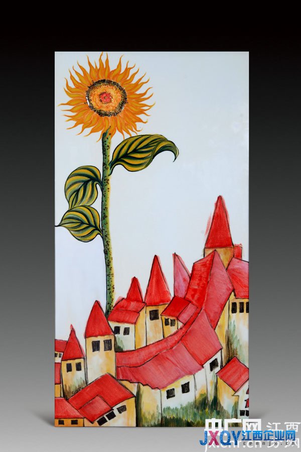 在她的向日葵系列瓷板畫作品中,有一幅被蘇姍列為“非賣品”的,是作者比較滿意的作品之一,畫面上呈現(xiàn)的是一排別致的鄉(xiāng)間小屋與極其高大的向日葵——它們的個(gè)頭甚至高過了小屋。這并非是荒誕的超現(xiàn)實(shí)主義繪畫,而是取材于真實(shí)事件,英國一戶人家培育出了高達(dá)8米的向日葵,其高度確實(shí)超越了自家的小別墅。蘇姍認(rèn)為這件事充分體現(xiàn)出向日葵的生命本質(zhì),那就是對(duì)光明的向往與追逐,那是一股令人欽佩的向陽的力量。