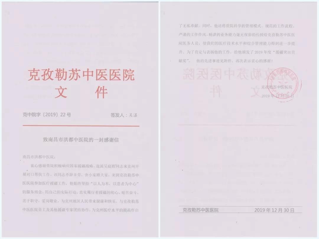 江西企業(yè)網(wǎng)訊 近日,南昌市洪都中醫(yī)院收到一封克孜勒蘇中醫(yī)醫(yī)院發(fā)來的感謝信。原來,2019年,南昌市洪都中醫(yī)院選派的援疆醫(yī)生骨傷十科主治中醫(yī)師吳庭勝在克孜勒蘇中醫(yī)醫(yī)院擔(dān)任康復(fù)科主任的半年期間真情奉獻,貢獻突出,不僅幫助當?shù)蒯t(yī)生提高了診療水平,還為許多克州同胞帶去了健康和快樂。這是克孜勒蘇中醫(yī)醫(yī)院首次寫感謝信給支援醫(yī)院,信件雖然簡短,但卻表達著他們對南昌市洪都中醫(yī)院大力支持援疆工作的綿長感激。