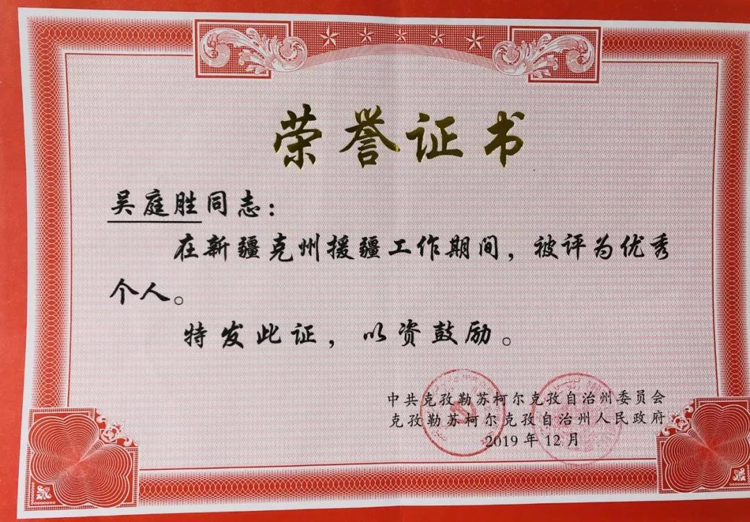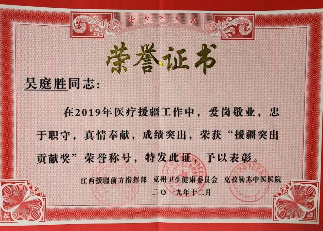 由于工作成績突出,吳庭勝先后榮獲克州黨委和政府聯(lián)合頒發(fā)的“援疆優(yōu)秀個人”、江西援疆前方指揮部和克州衛(wèi)健委聯(lián)合授予的“援疆突出貢獻獎”等榮譽稱號。