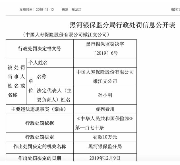 實(shí)際上,記者查閱公開資料發(fā)現(xiàn),2019年12月9日,中國人壽嫩江支公司曾因虛列費(fèi)用被黑河銀保監(jiān)分局連開4張罰單,其中法定代表人孫小剛,與網(wǎng)友“兔寶寶1988Z”的舉報(bào)中提到的公司名和主要負(fù)責(zé)人名稱一致,該行政處罰顯示,孫小剛個(gè)人被罰款10萬元。